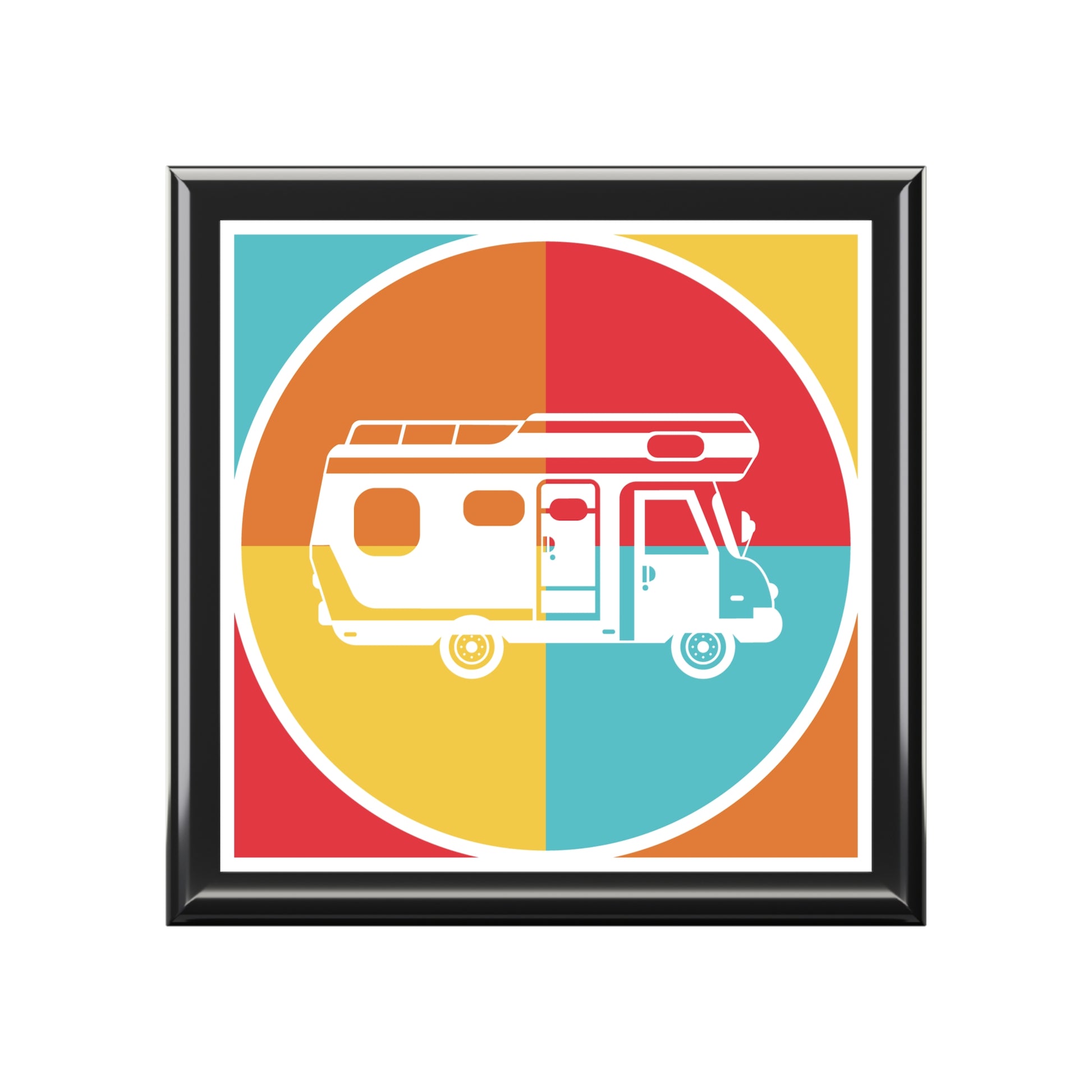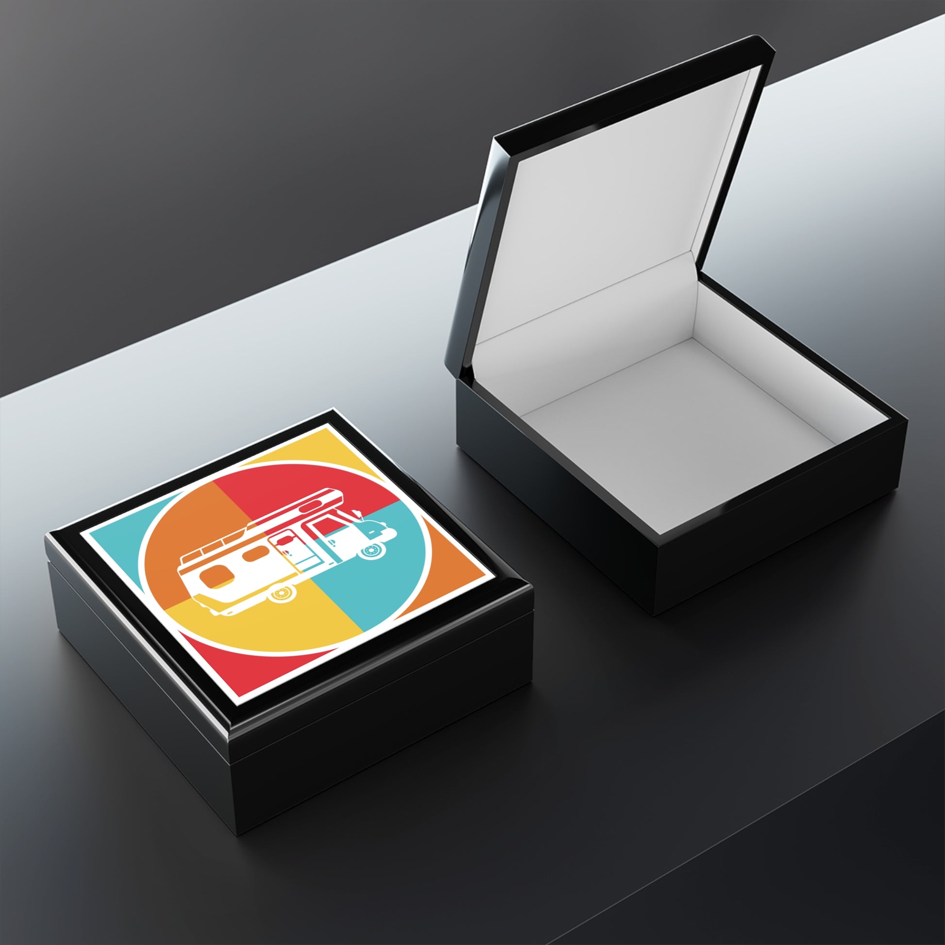 This jewelry box features a clean, minimalist illustration of a camper van set inside a geometric circular design with warm, balanced colors. The artwork is inspired by road trips, slow travel, and the feeling of freedom that comes with life on the move, making it both playful and meaningful.
