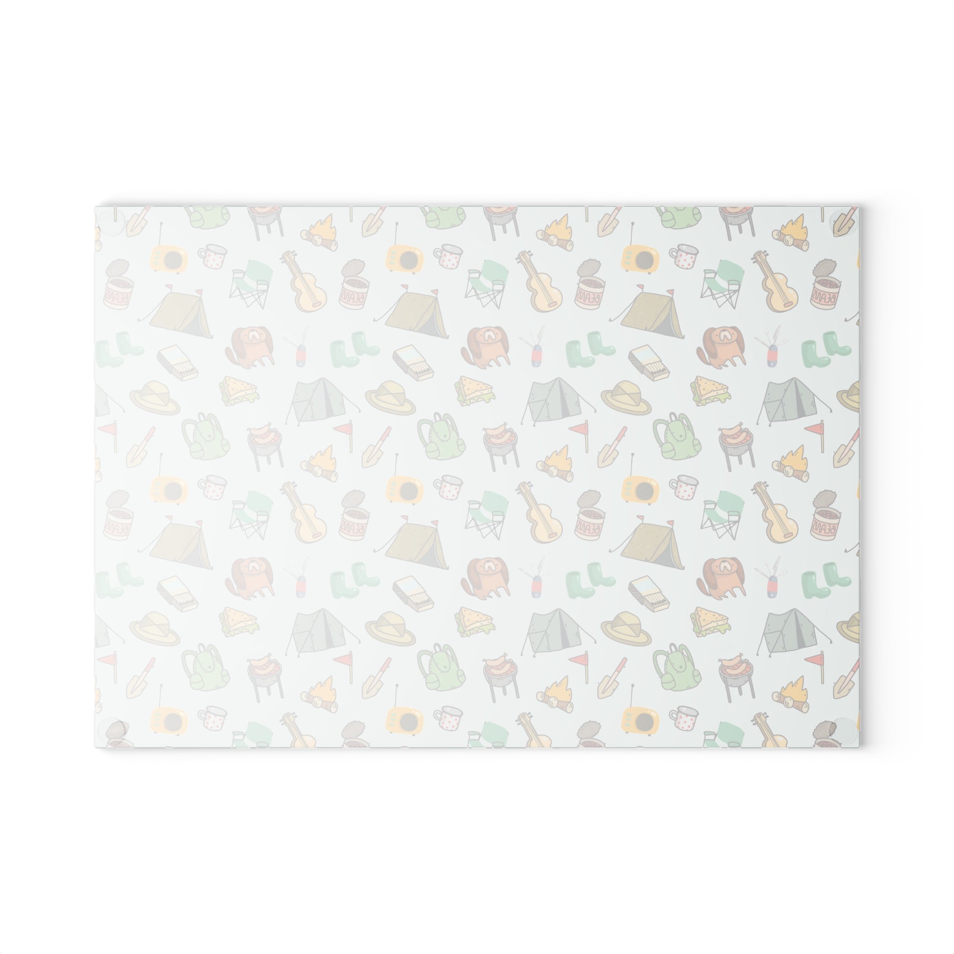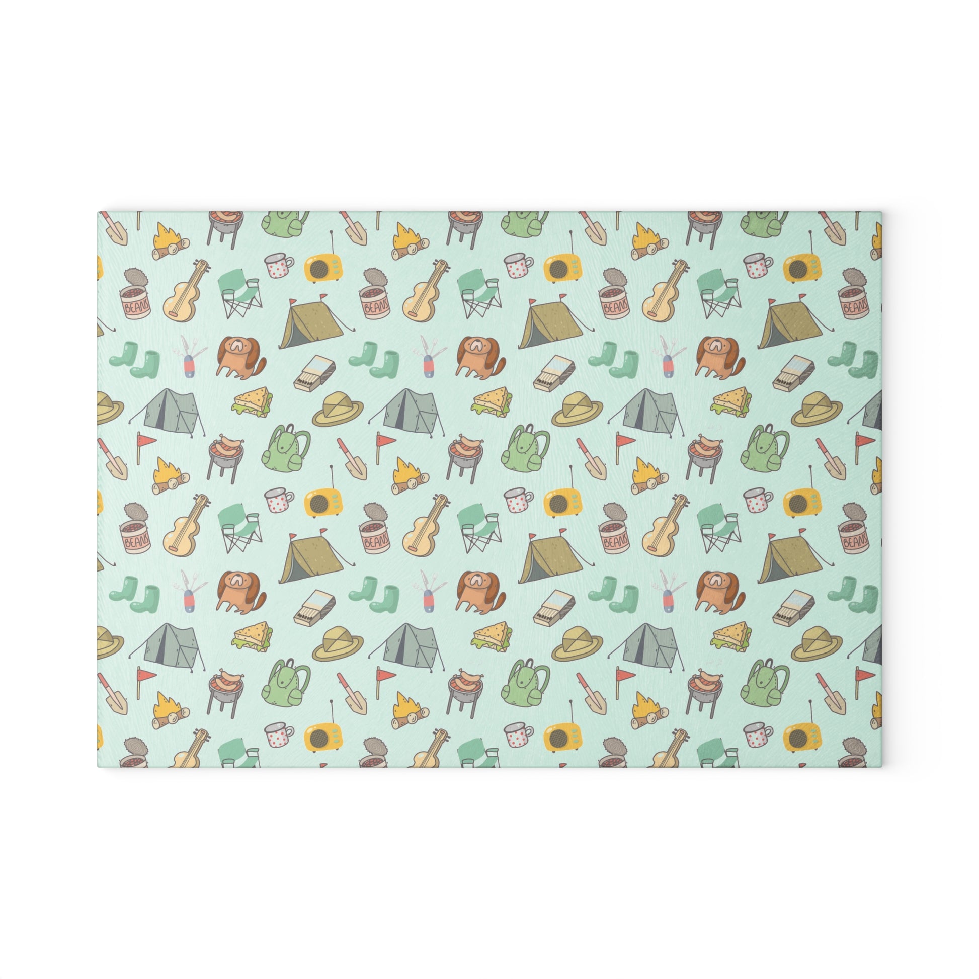 This glass cutting board features a playful all-over camping pattern with illustrated outdoor essentials like tents, backpacks, campfires, guitars, mugs, hats, and lanterns. The repeating design creates a fun, relaxed vibe that instantly brings the feeling of camping trips, road adventures, and carefree days in nature into your kitchen. Designed for people who love the camping lifestyle, van life, and outdoor adventures, this board adds character and warmth to everyday cooking. The soft colors and hand-drawn style make it easy to match with rustic, cozy, or nature-inspired kitchens, while also standing out as a decorative accent. Made from durable tempered glass, this cutting board offers a smooth, non-porous surface that resists stains, odors, and heat. Itβs easy to clean and suitable for daily food prep, serving snacks, or protecting countertops β practical without sacrificing style. Perfect as a gift for campers, hikers, RV owners, outdoor enthusiasts, or anyone who feels happiest around a campfire. A great choice for housewarmings, birthdays, holidays, or as a cheerful kitchen upgrade that celebrates life outdoors. A functional kitchen essential that captures the joy, freedom, and simplicity of camping life β even when youβre at home.