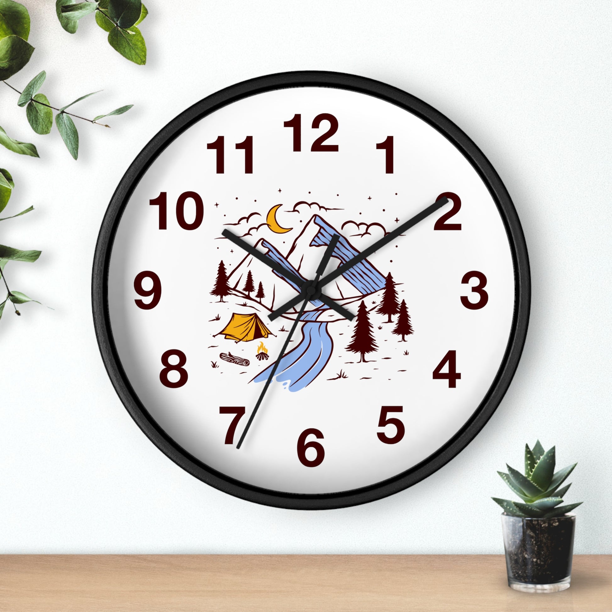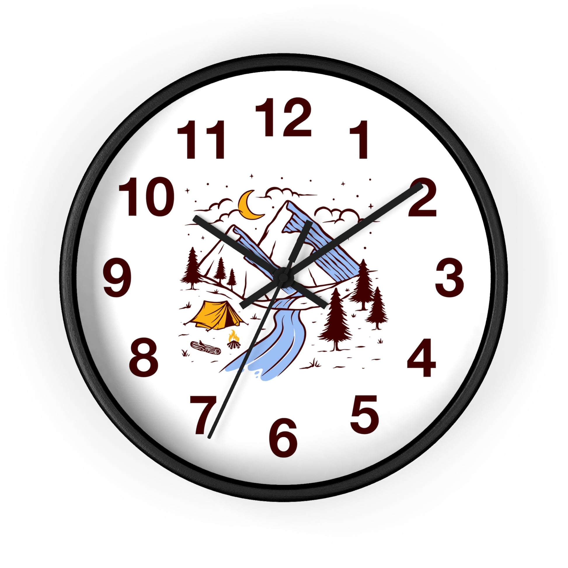 Mountain Camping Night Wall Clock with Forest and River Illustration