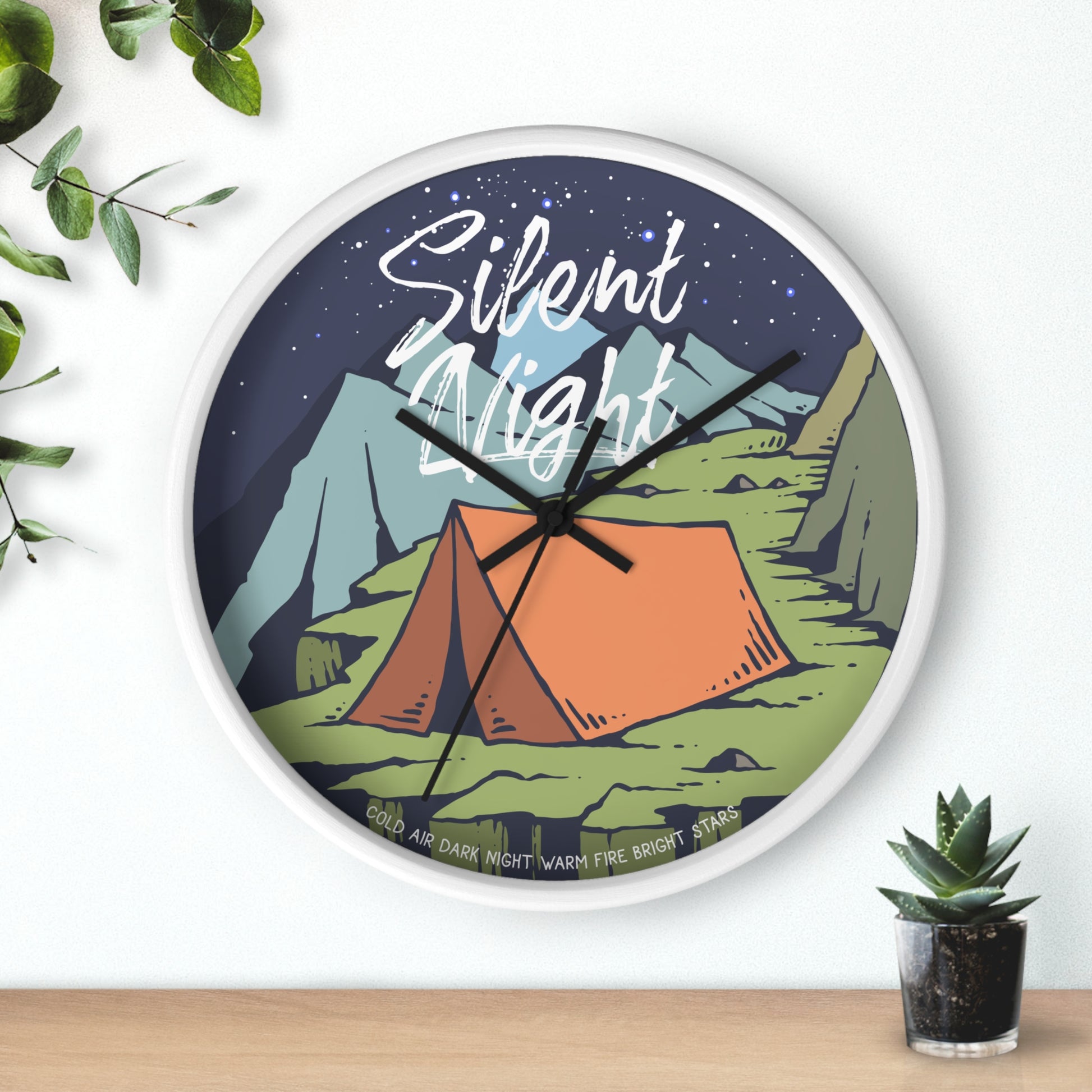 This wall clock captures the quiet beauty of a night outdoors — a tent resting under a star-filled sky, mountains in the distance, and the stillness that comes after the fire fades. The words “Silent Night” set a calm, reflective mood and invite you to slow down.